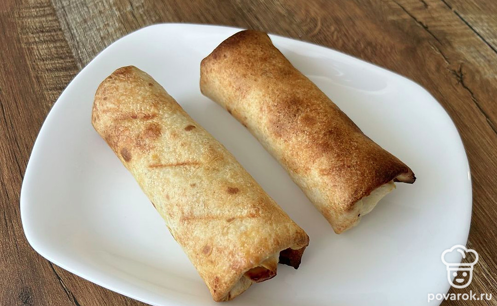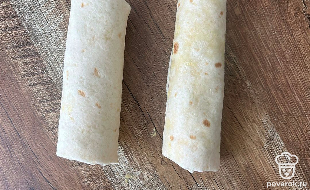Сверните в рулетик. Отправьте в разогретую до 200 градусов духовку на 10 минут.