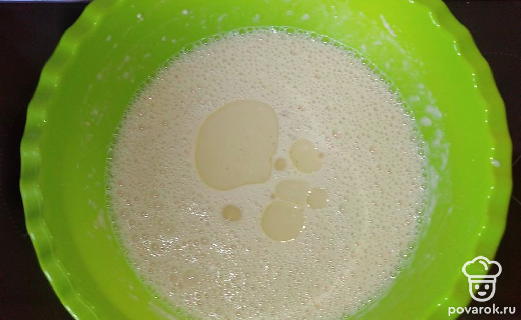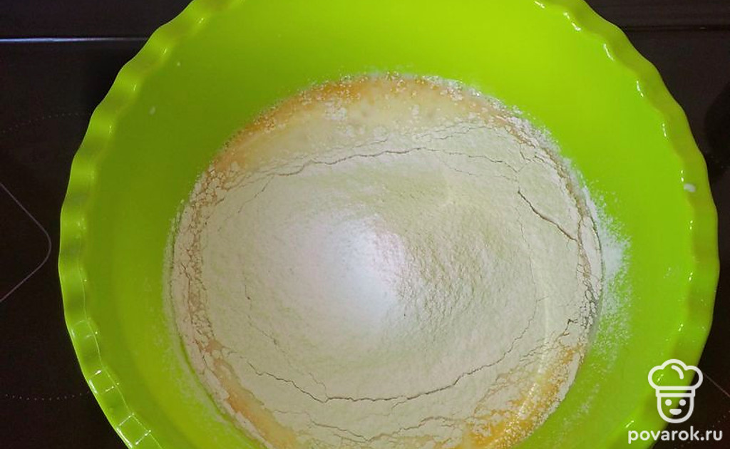 Ввести муку и взбивать миксером, пока не будет однородное тесто.