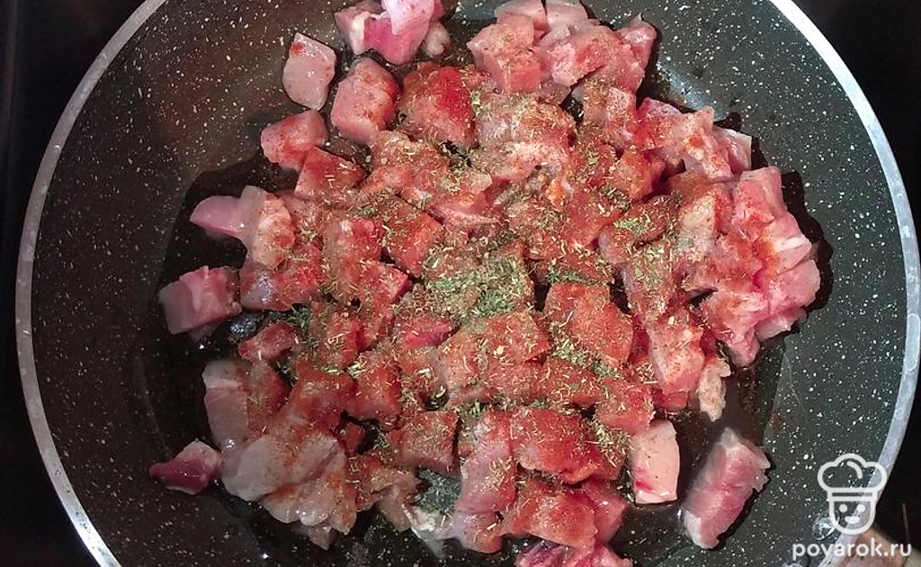 Филе курицы нарезать на небольшие кусочки, посолить, добавить специи — укроп, петрушка и паприку. Томить до готовности минут 30-40.