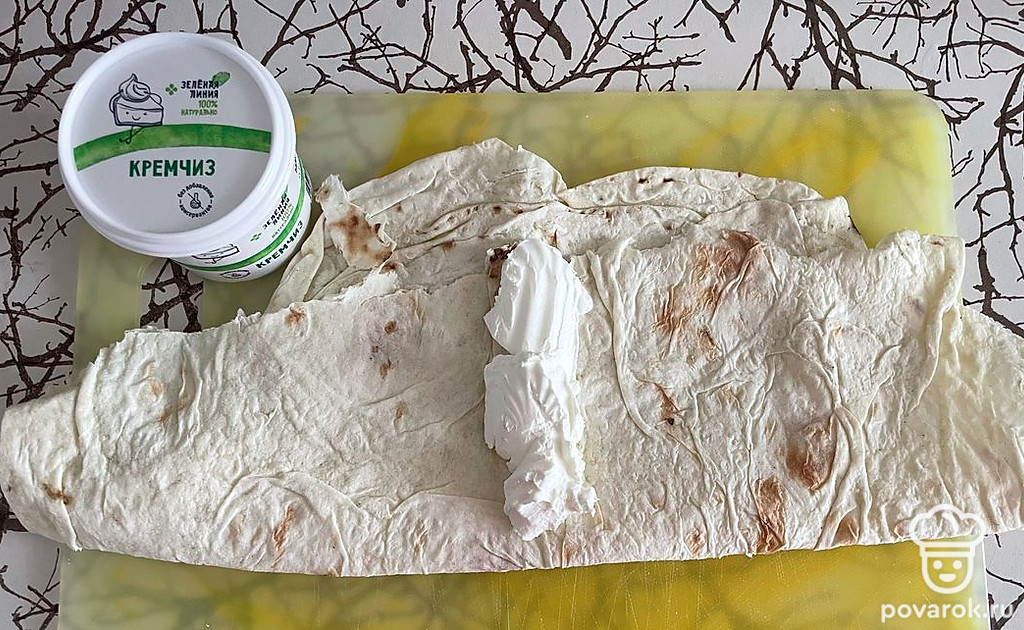 Лаваш сложите в два слоя. Разверните и серединку смажьте крем-чизом.