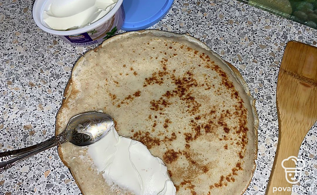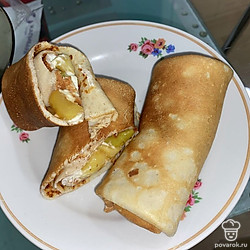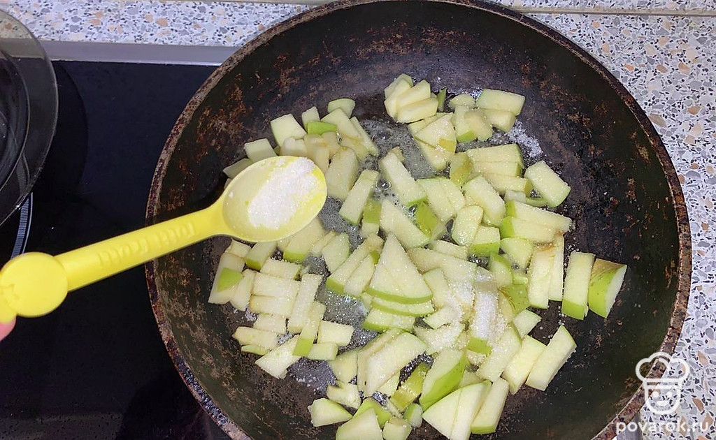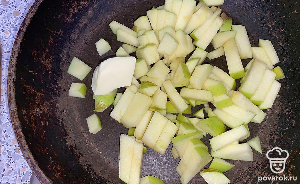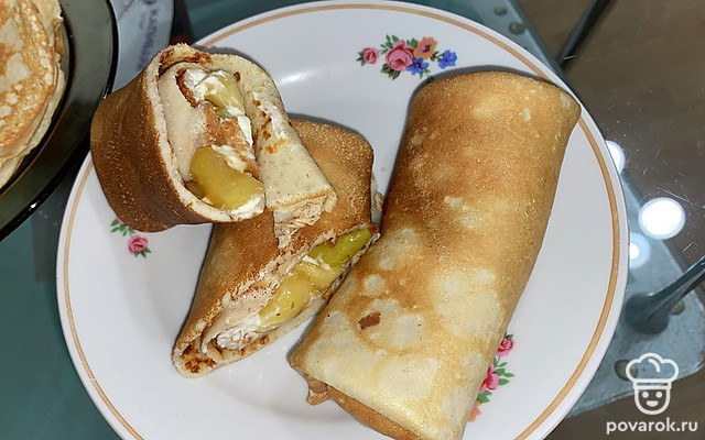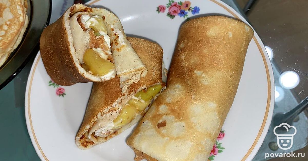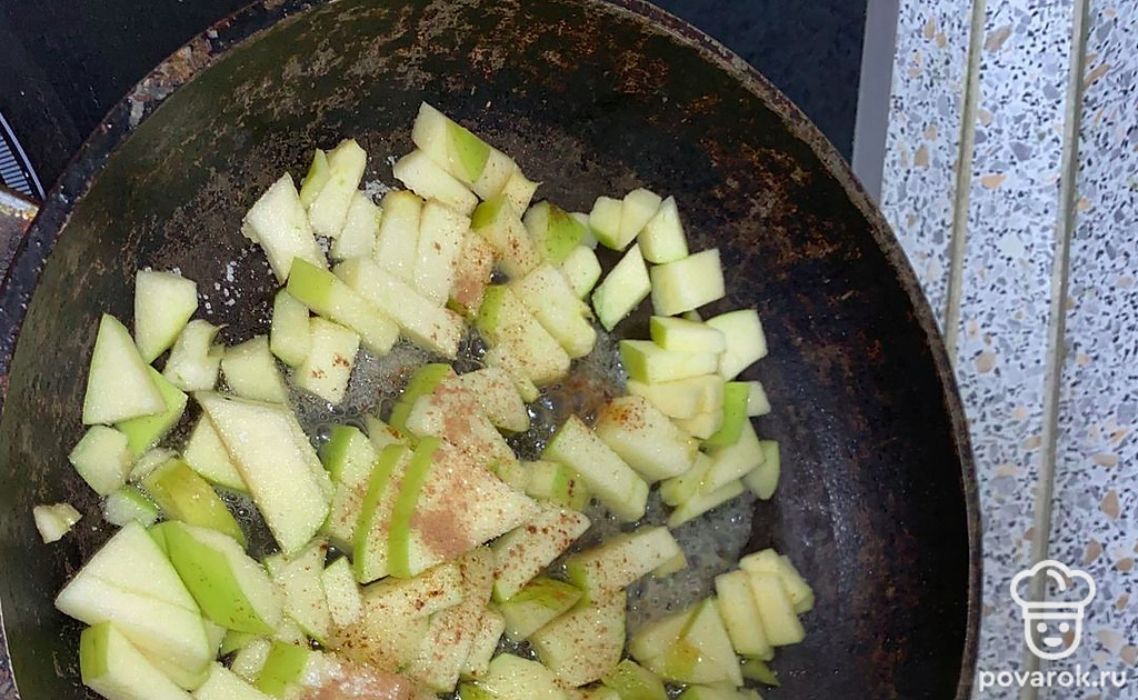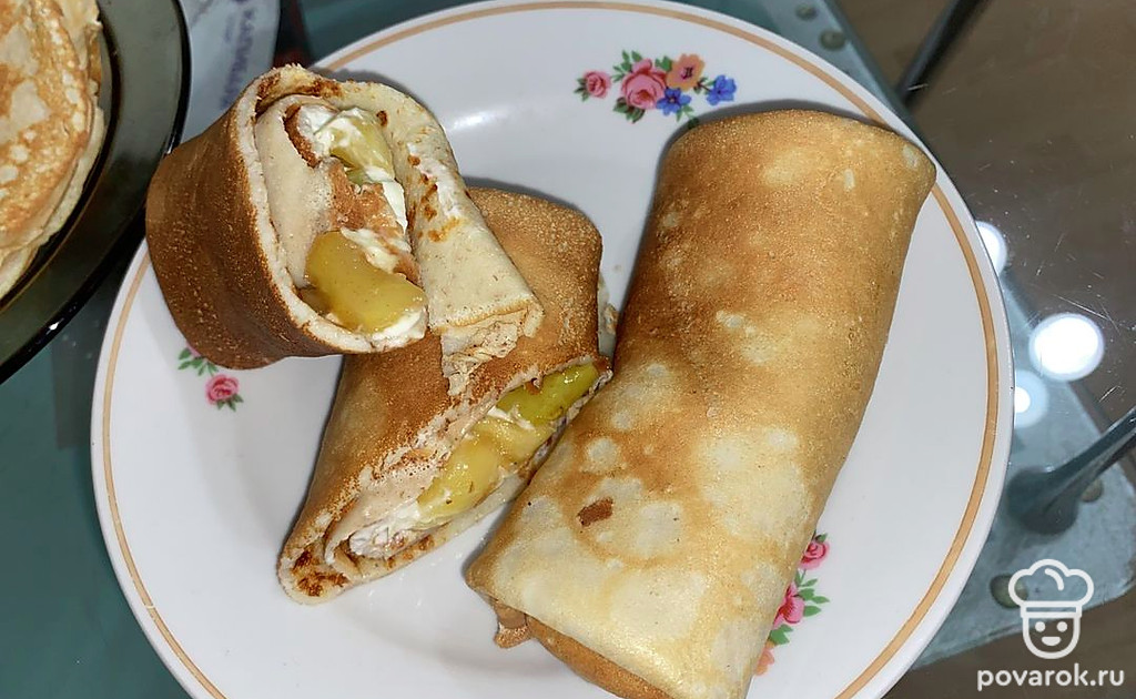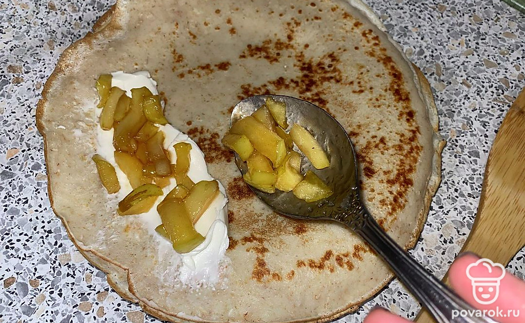 После добавляем готовые жареные яблоки и заворачиваем блин.