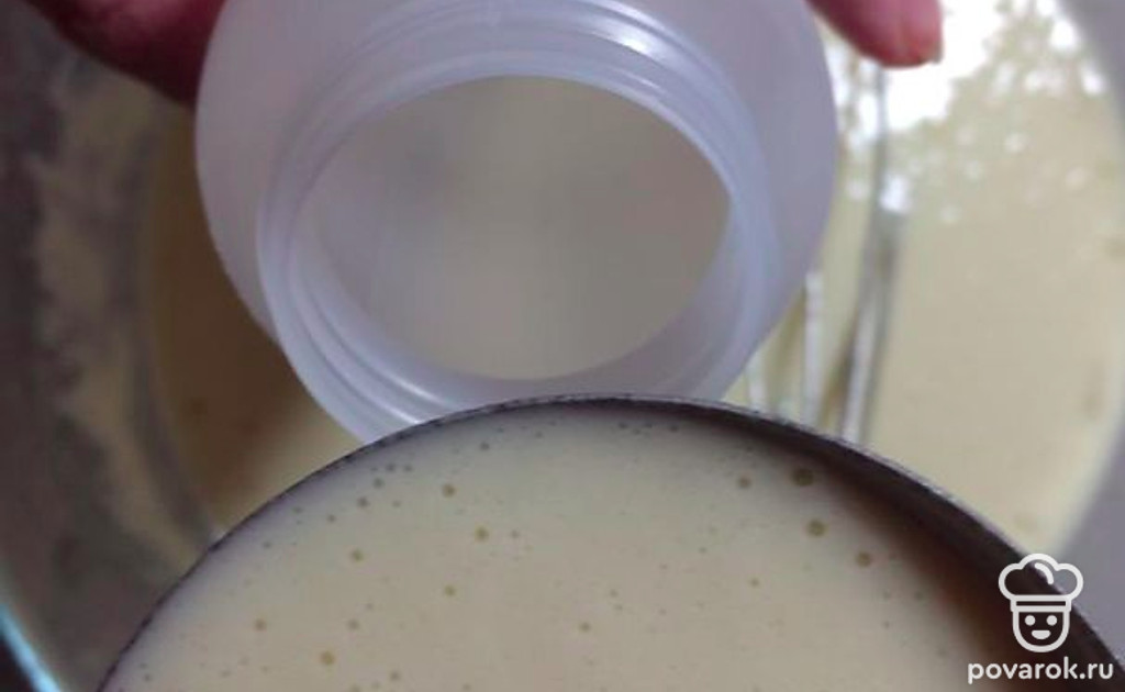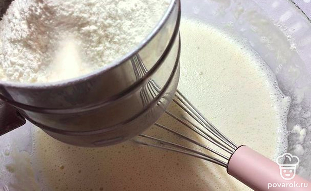 Приготовьте тесто. Для этого смешайте яйца, сахар, молоко и муку. Пробейте блендером до однородной массы. Влейте растительное масло.