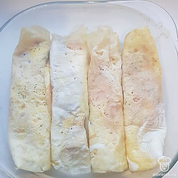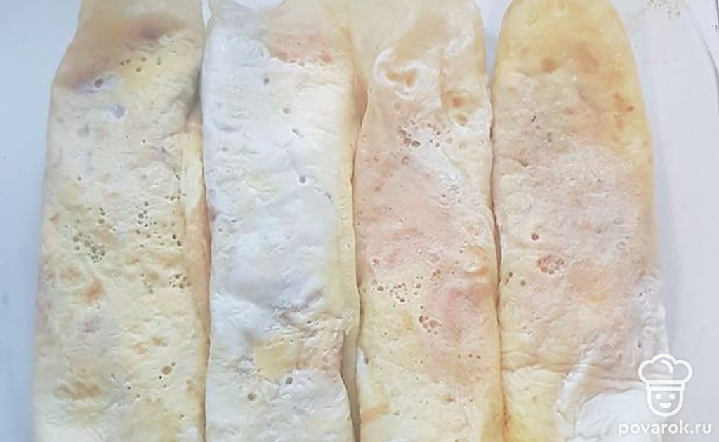 Жарим яичный блин и выкладываем фарш, сворачиваем рулетом.