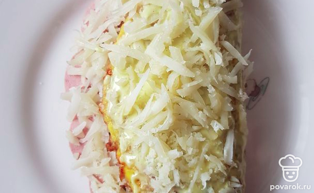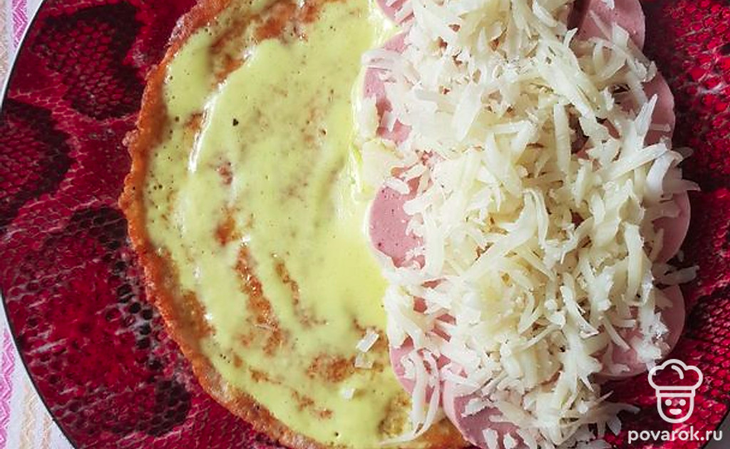 Перед подачей на стол нанесите майонез на овсяноблин и покройте его тертым сыром.