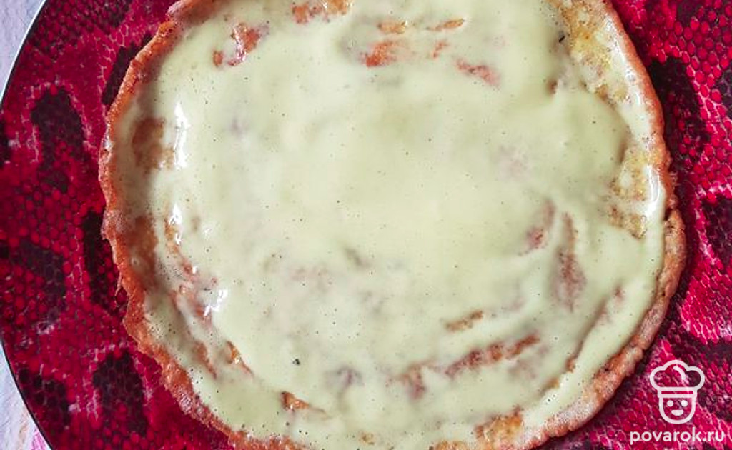 Готовый овсяноблин переложите на тарелку и смажьте майонезом по всей поверхности.