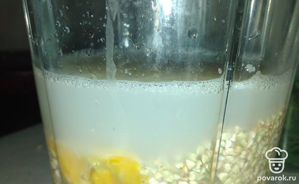 Берём яйца, зелёную гречку, соль и стакан воды и все помещаем в блендер.