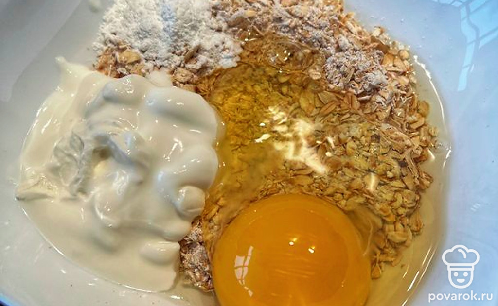 Добавляем сметану, яйцо, разрыхлитель и тщательно перемешиваем.