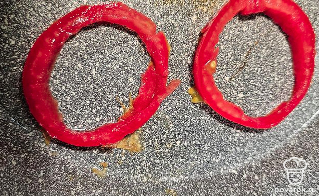 Большой помидор нарезаем кружочками, удаляем сердцевину помидора.