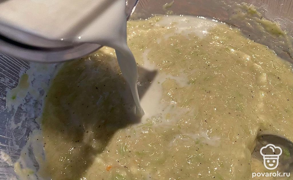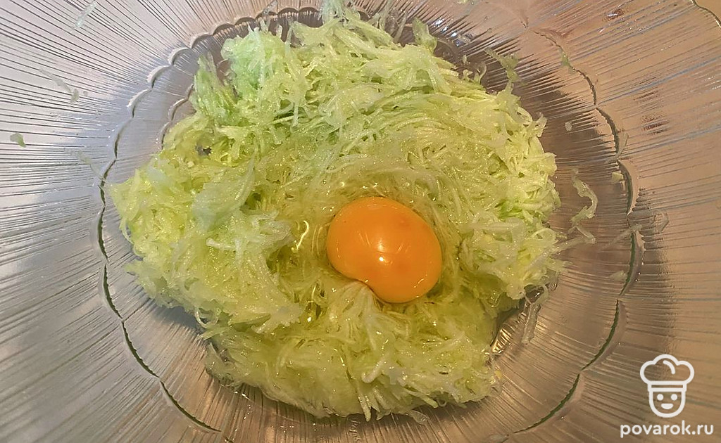 Натрите кабачок на мелкой терке и вбейте одно яйцо.