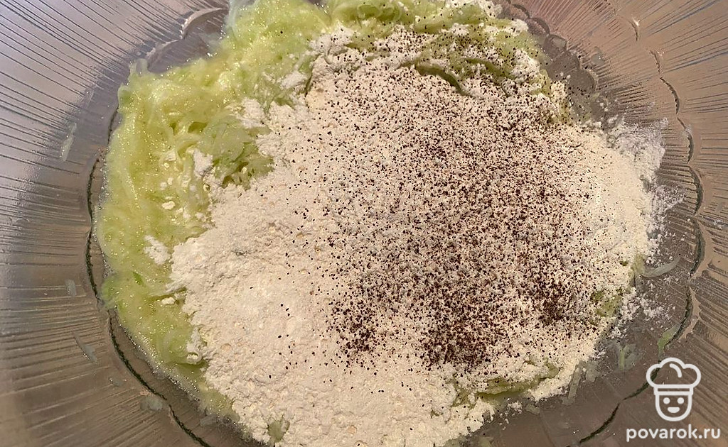 Добавьте муку и соль с перцем. Тщательно перемешайте.