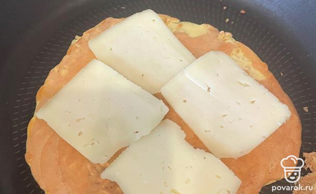 Овсяноблин обжариваем с одной стороны, переворачиваем на другую обжариваться. Сразу выкладываем сыр, чтобы растопился. Держим немного под крышкой.
