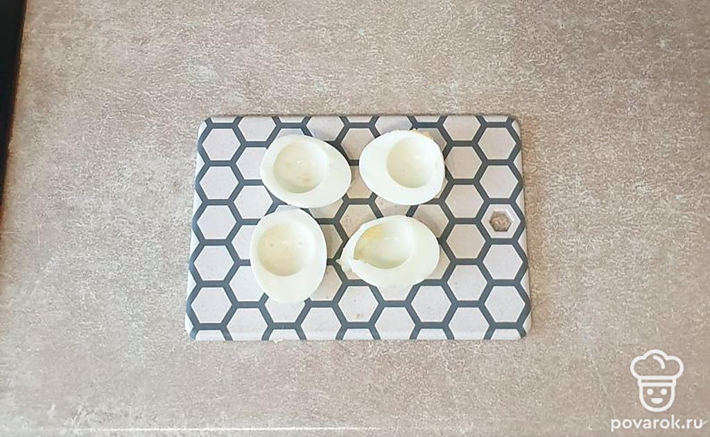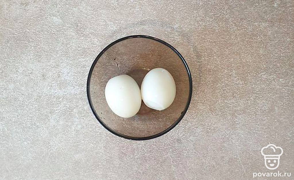 Яйца хорошо помойте, положите в кастрюлю и залейте холодной водой. После закипания огонь сократите и варите 8-9 минут. Готовые яйца переложите в ледяную воду и дайте остыть. Затем очистите от скорлупы и промойте в воде.