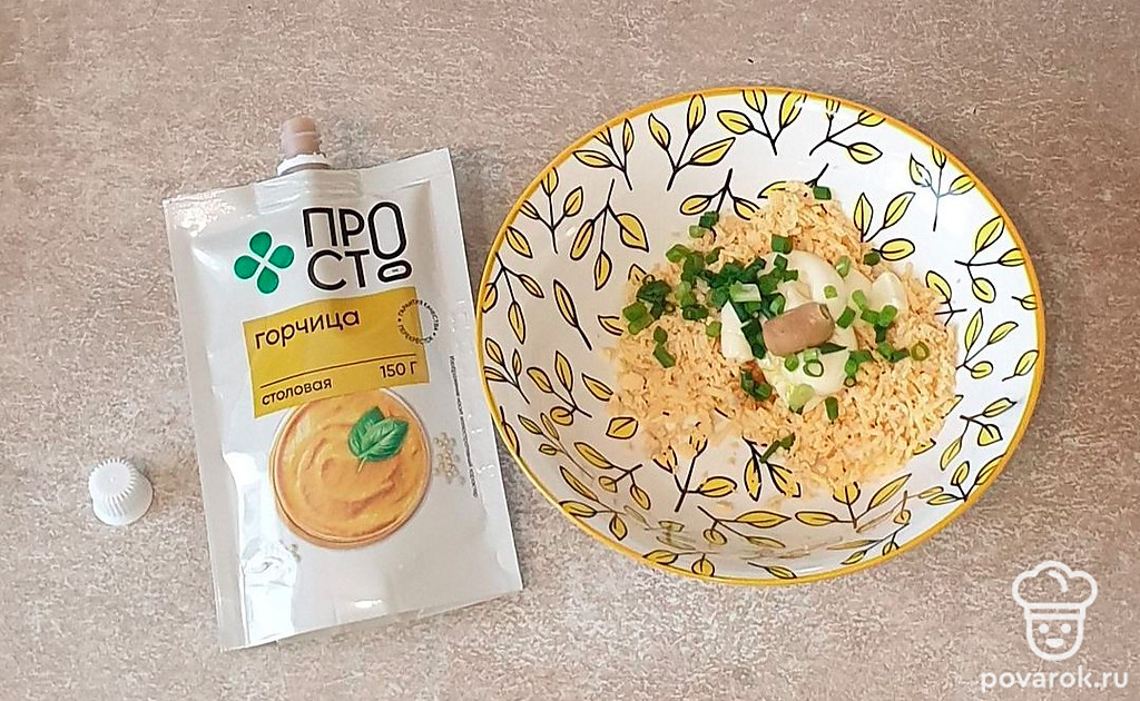 В глубокую миску натрите на мелкой терке желток. Всыпьте соль и перец. Добавьте мед, майонез, зеленый лук и горчицу. Хорошо все перемешайте.