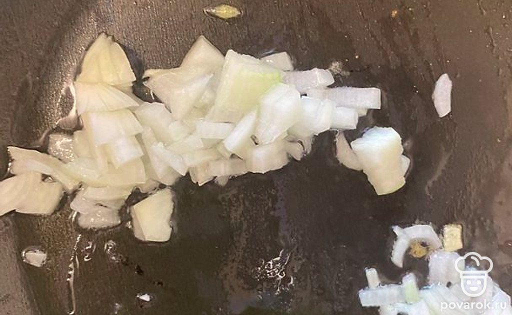 Лук почистите, помойте, порежьте на мелкие кусочки. Поставьте жариться на растительном масле.