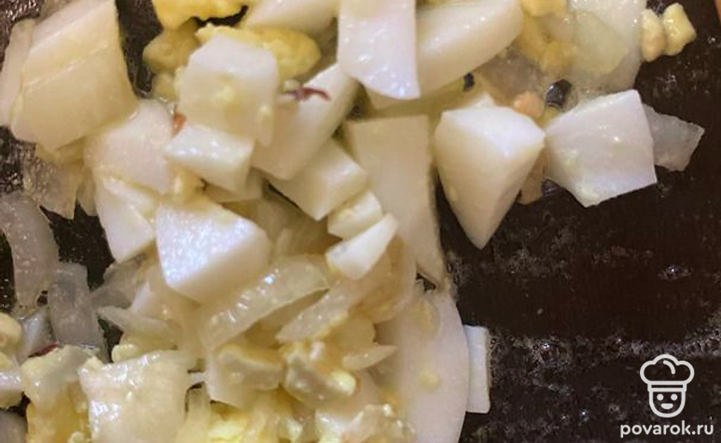 Яйцо отварите, почистите, порежьте мелко и добавьте обжариться к луку.