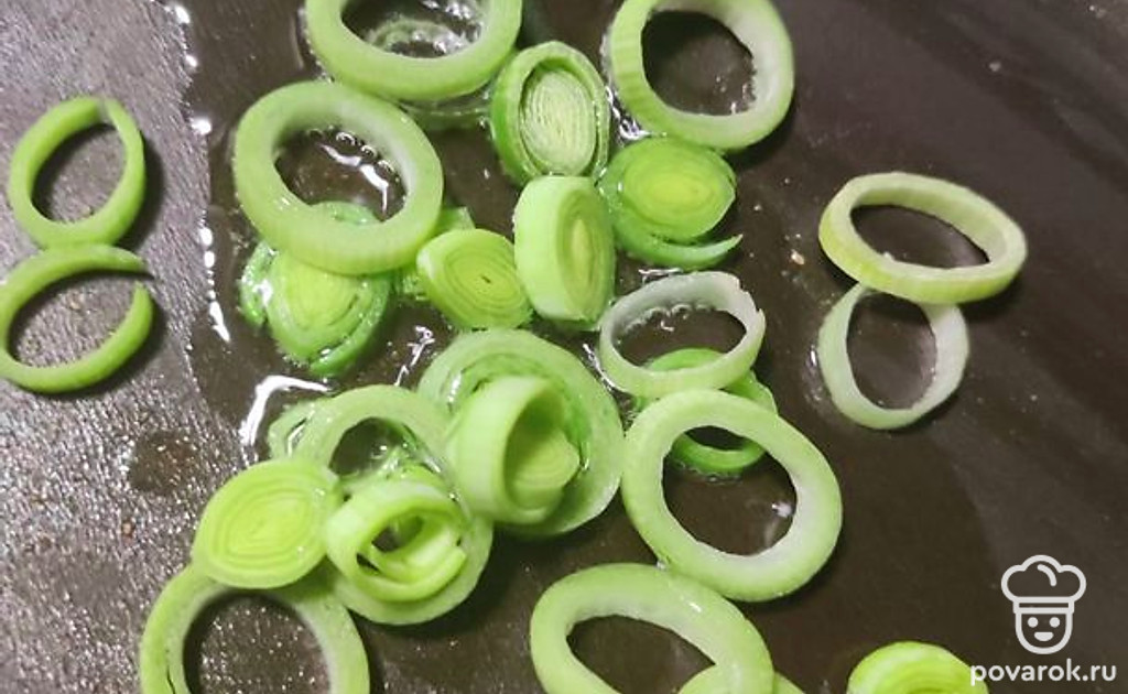 Режем лук колечками и отправляем жарить на оливковом масле.