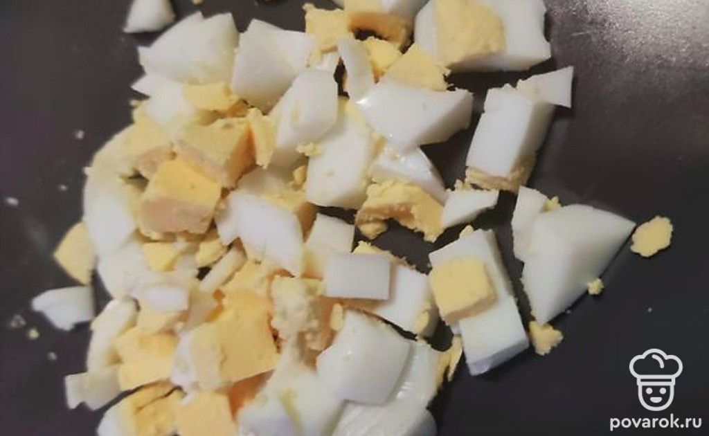 Нарезаем отварные яйца кубиками.