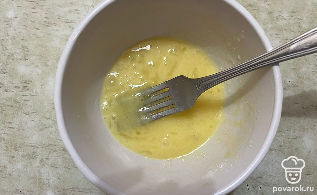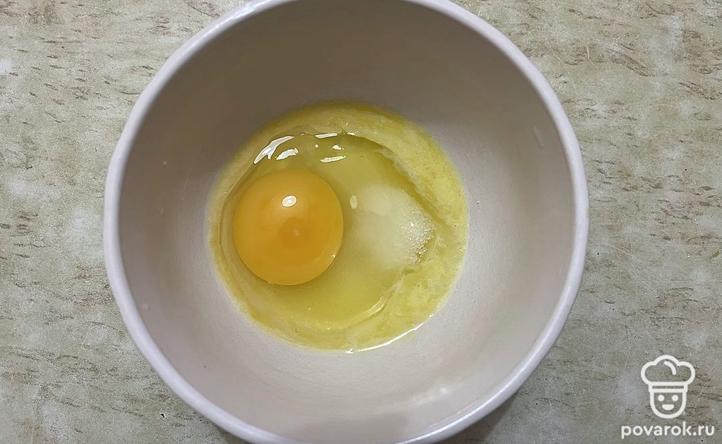 В глубокую миску разбейте яйцо, добавьте к нему сахар и растопленное масло.