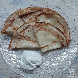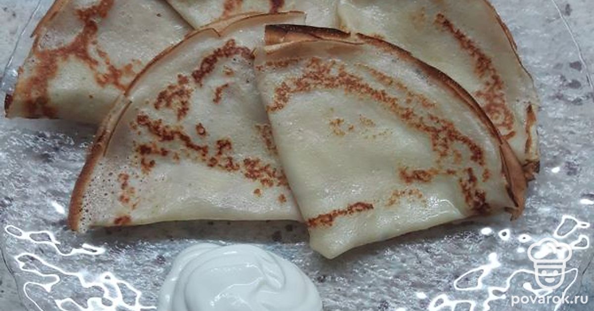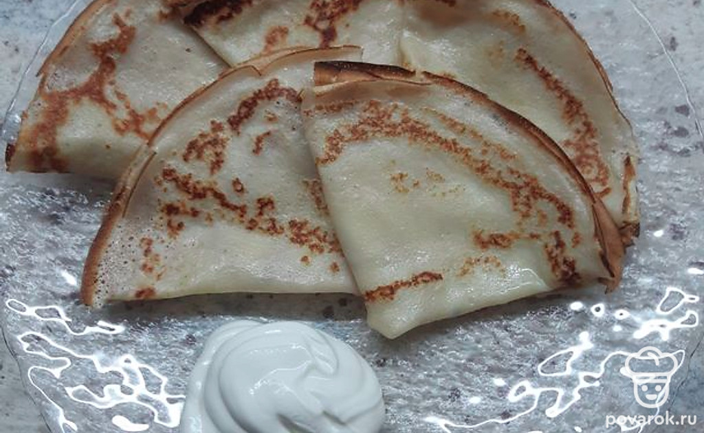 Блинчики сворачиваем в треугольник и подаем со сметаной.