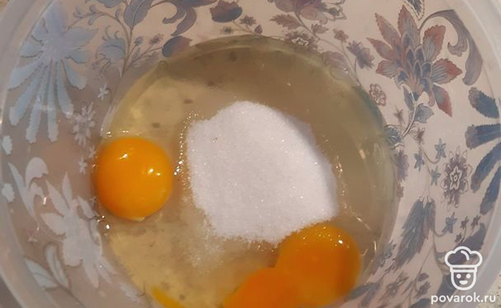 Берем 2 яйца, добавляем соль и сахар, взбиваем.