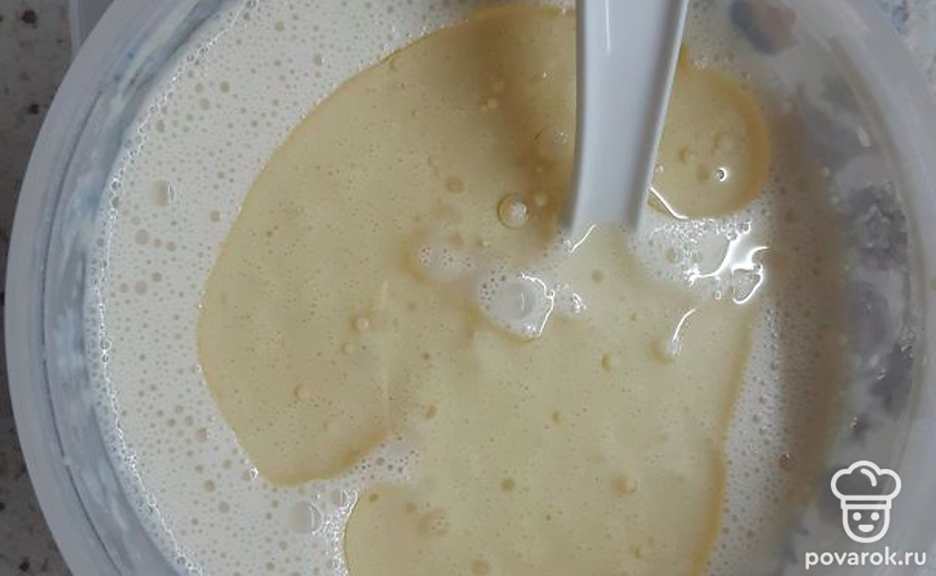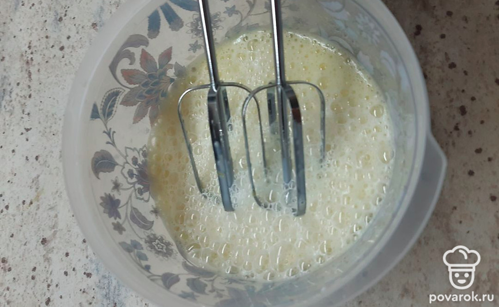 Во взбитые яйца добавляем молоко и опять взбиваем.