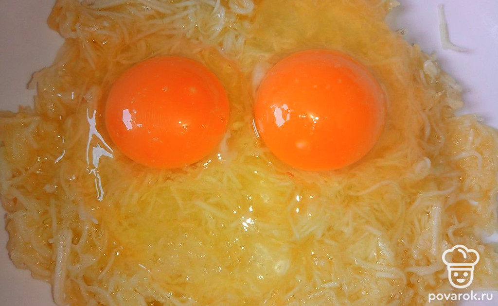 Натрите кабачок на мелкой терке (сок отжимать не нужно). Добавьте к тертому кабачку 2 яйца.