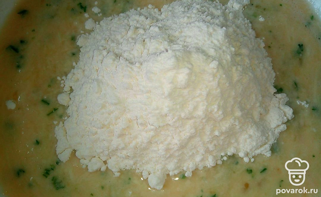 Накрошите мелко свежую зелень и добавьте ее в молочно-яичную массу с тертым кабачком.