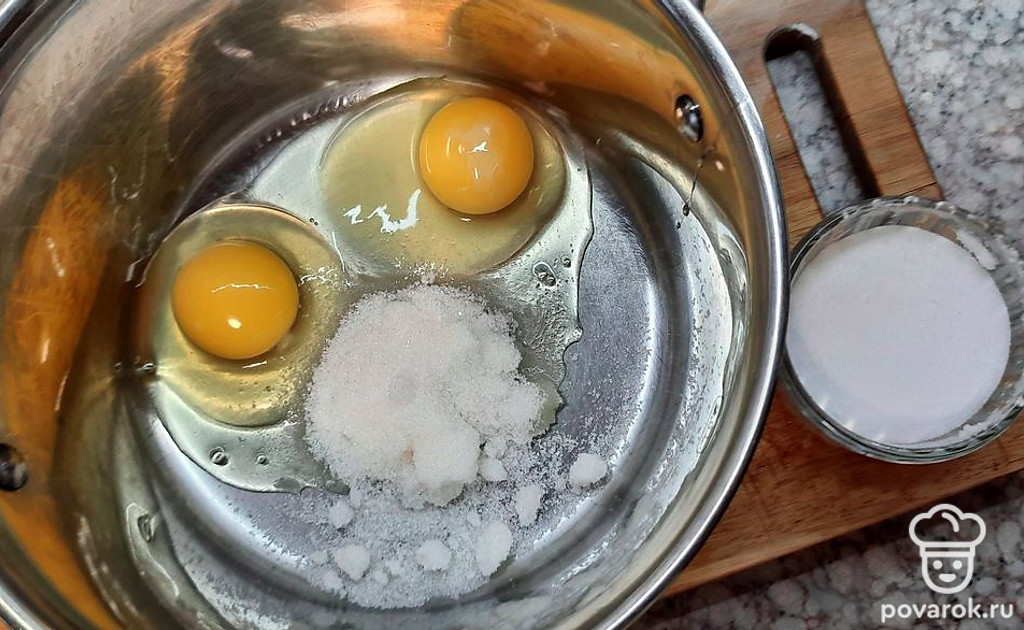 В глубокую емкость разбить 2 яйца и добавить сахар.