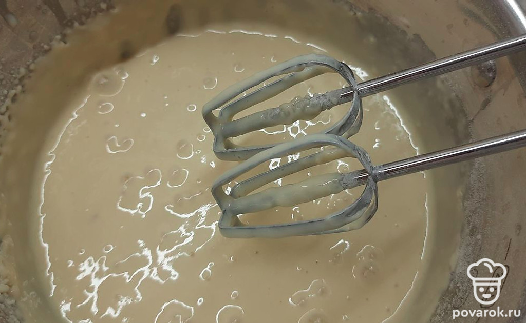 Добавить к яйцам с сахаром муку и молоко, хорошо перемешать.