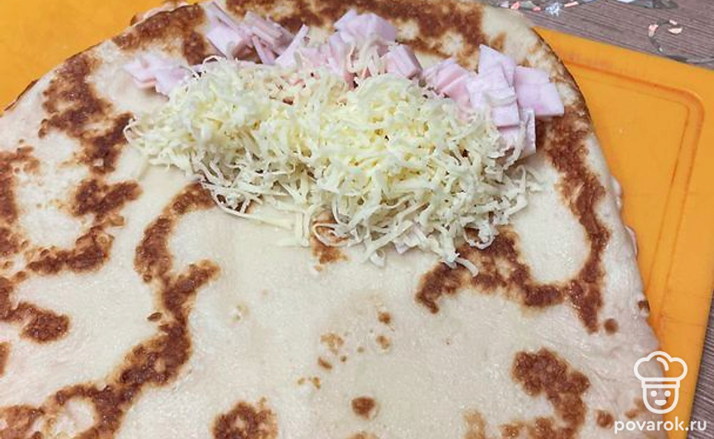 Выкладываем ветчину и сыр. Складываем блинчик любым удобным способом.