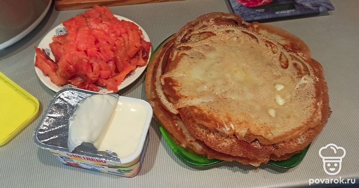 Намазать плавленым сыром, положить кусочек семги и свернуть в трубочку.