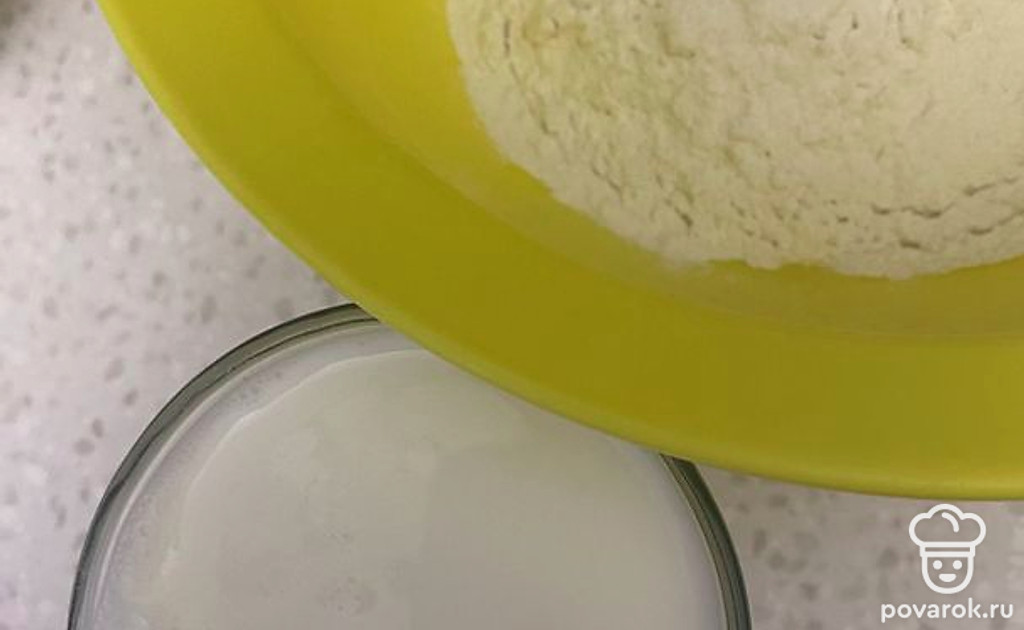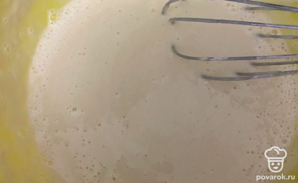 Посолить, всыпать муку, разрыхлитель, хорошо перемешать, добавляя молоко.