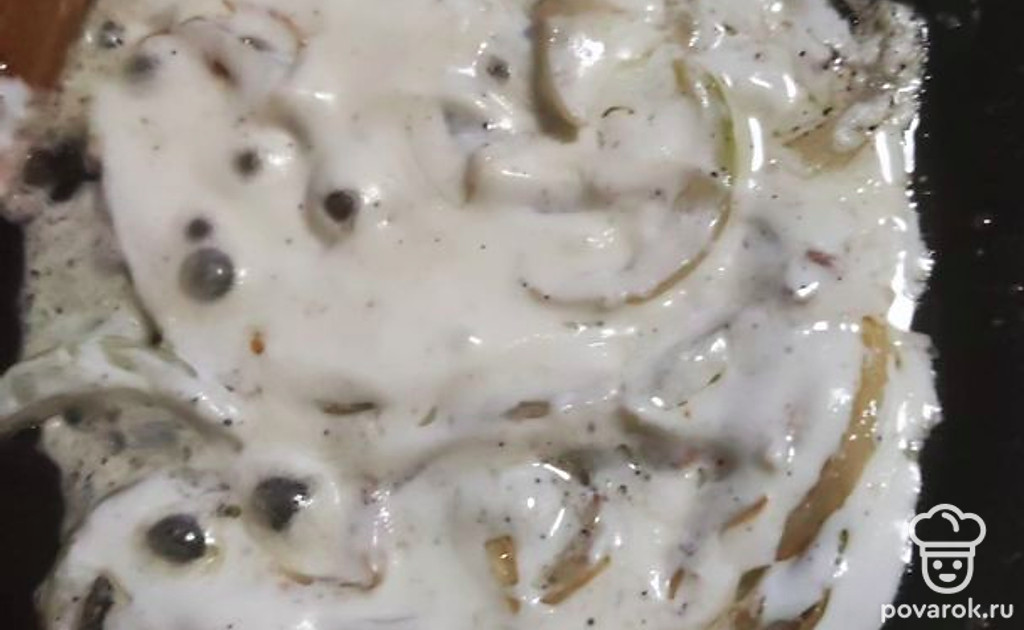 Добавляем сметану, соль и перец. Тушим еще минут 5-7.