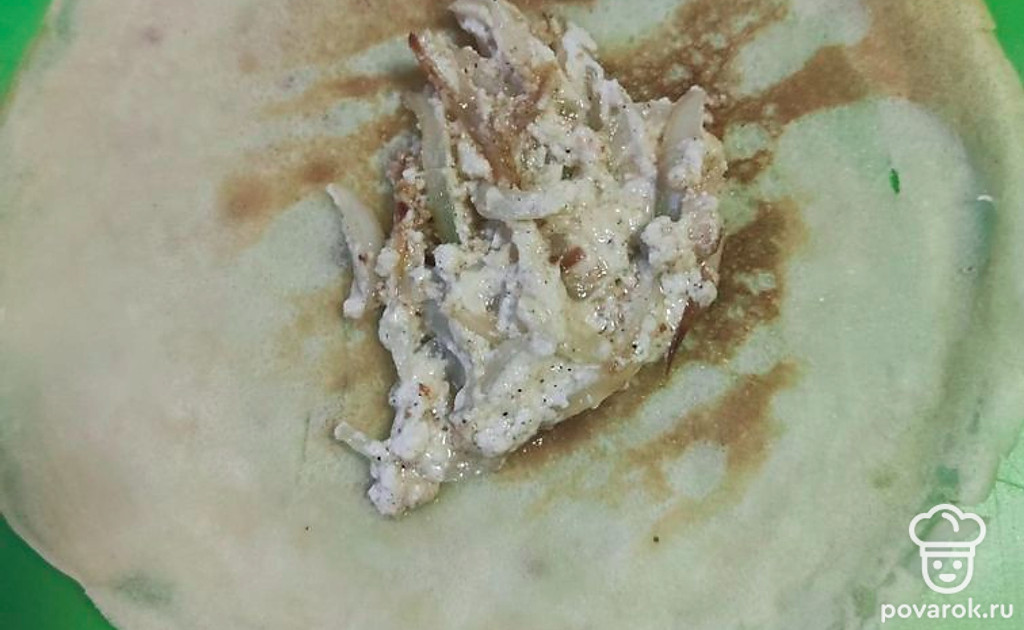 Выкладываем начинку на блинчик, закрываем конвертиком.