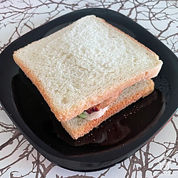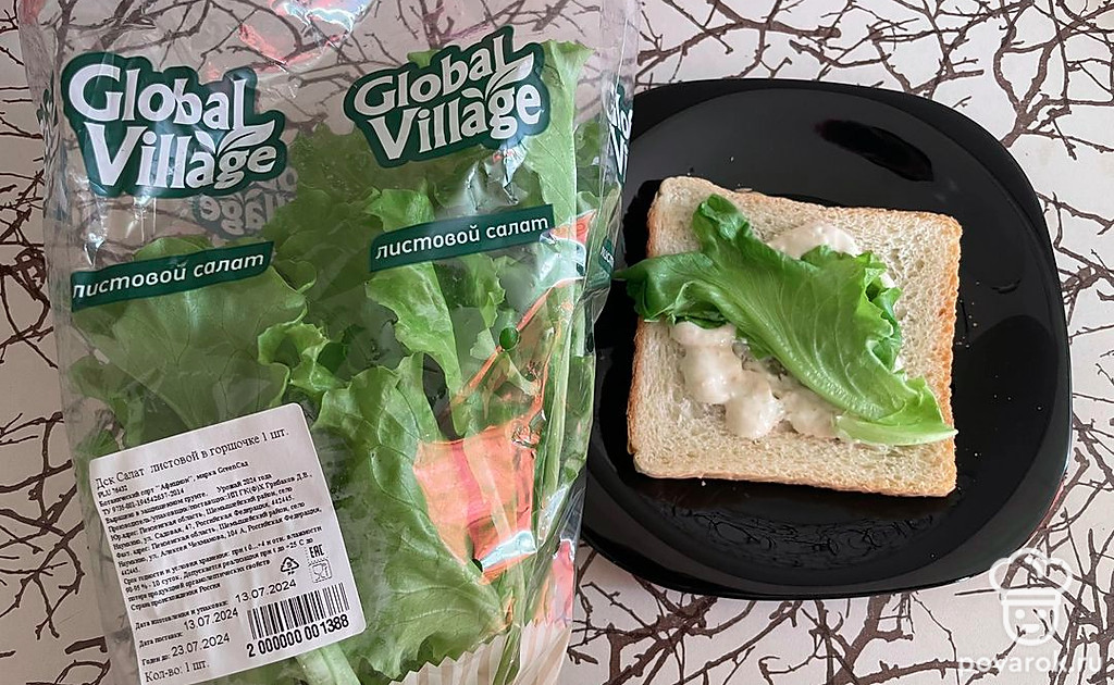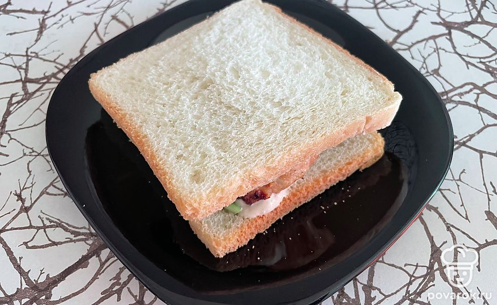 Смажьте чесночным соусом второй ломтик хлеба и закройте сэндвич. Можете разогреть сэндвич в микроволной печи. Приятного аппетита!