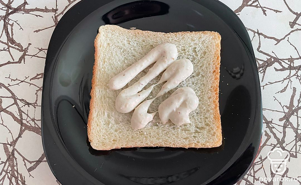 Возьмите один ломтик хлеба, намажьте его чесночным соусом.