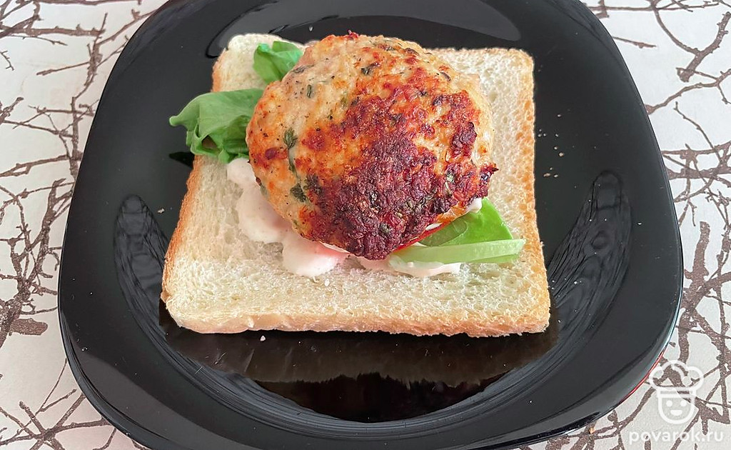Выложите тонко нарезанный ломтик томата, сверху аккуратно положите котлету.