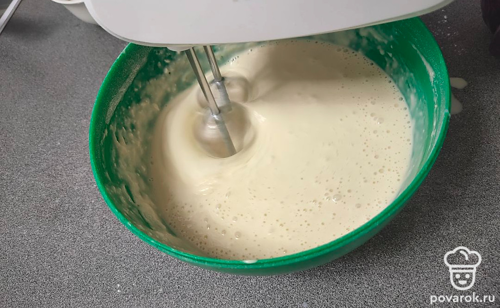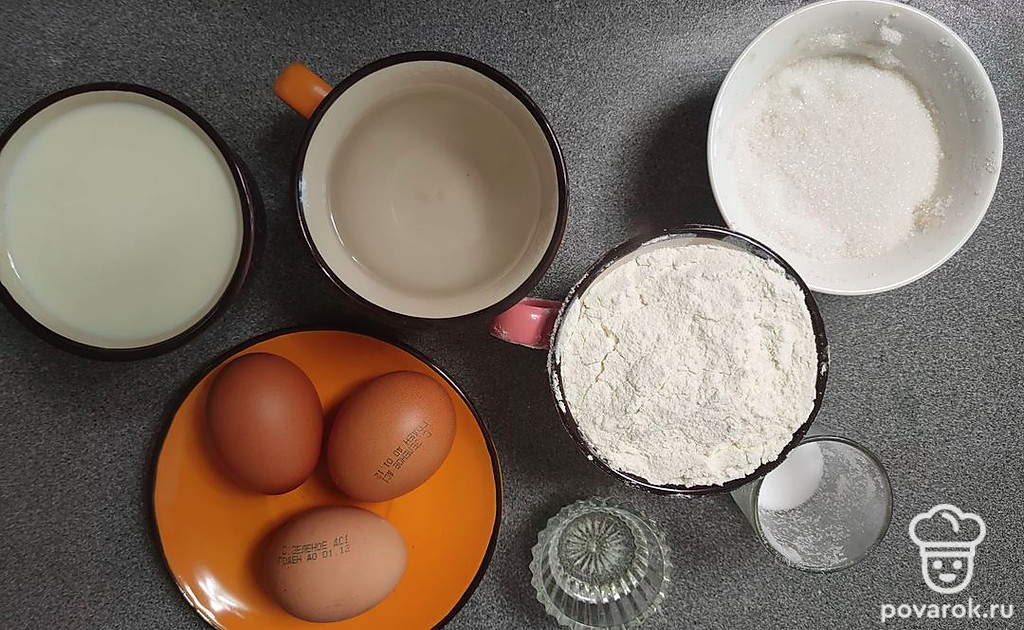 Налейте в миску молоко, яйца, соль, сахар и перемешайте. Далее добавьте муку и перемешайте венчиком или миксером. Затем добавьте крутой кипяток. Если хотите блины потоньше, можно добавить больше 1 стакана.