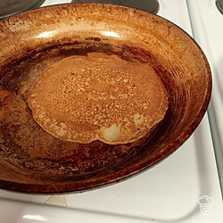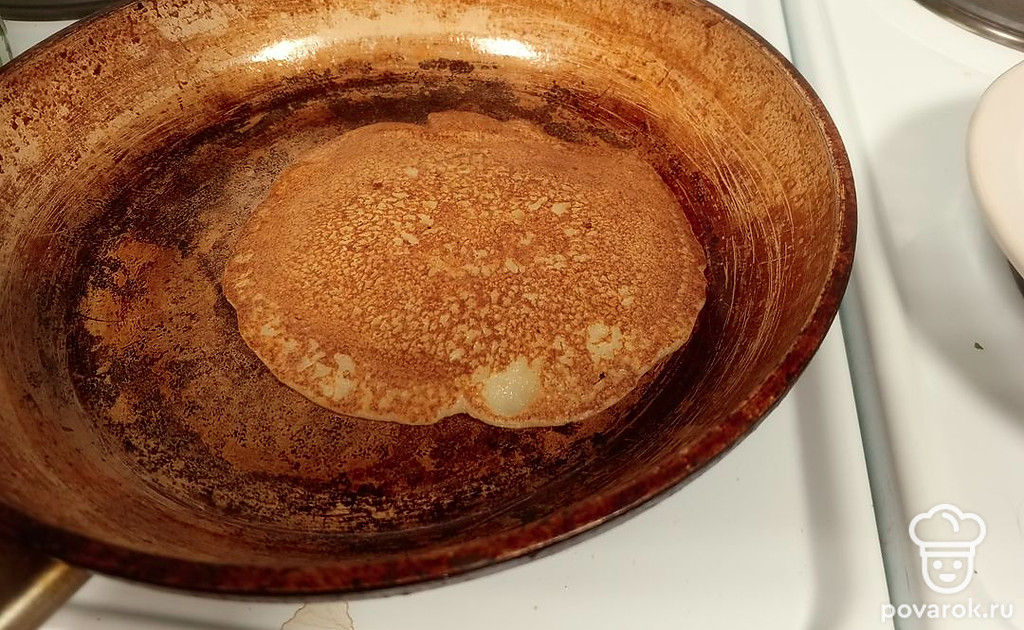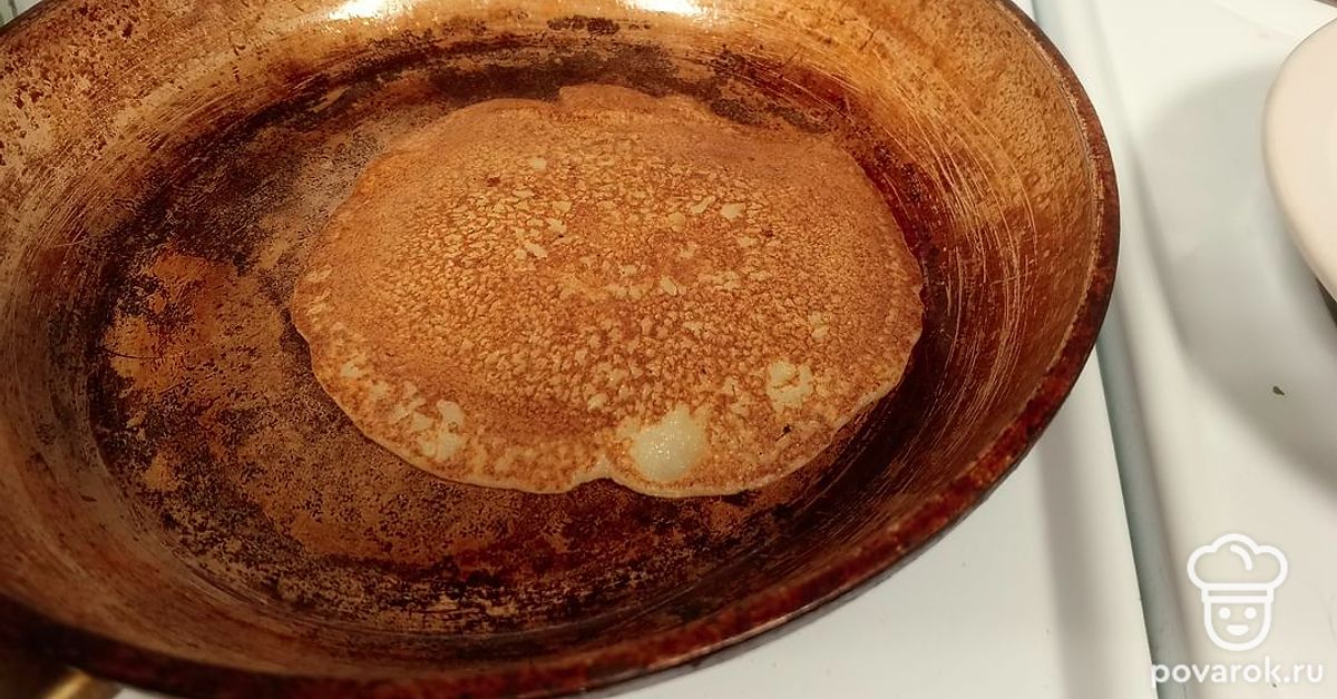 Раскалить сковородку на сильном огне. Я беру чугунную. Первый раз смазать сковородку небольшим количеством растительного масла и налить смесь половником. Выпекать 2-3 минуты, пока не появятся пузырьки. Перевернуть блин, обжарить с другой стороны 1 минуту. Готовые блины смазать сливочным маслом или топленым. Приятного аппетита!