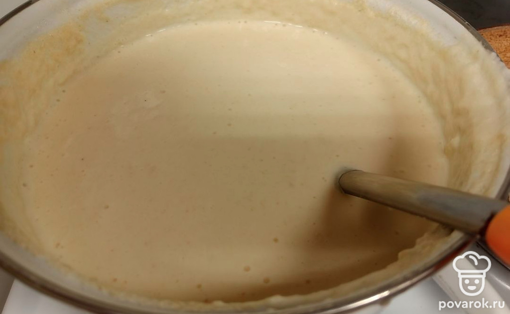 Добавить в кашицу 2 яйца, вскипятить молоко, добавить соль. Залить манку крутым молоком, помешивая. Дать постоять 1 час, пока она не начнет бродить. Появятся пузырьки. Должна получиться тягучая смесь. Нельзя допустить, чтобы яйца свернулись, поэтому надо вливать молоко и помешивать манку.