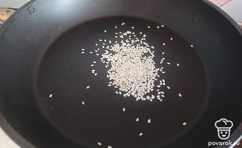 Кунжут обжарьте на сковороде до золотистого цвета (4 минуты).