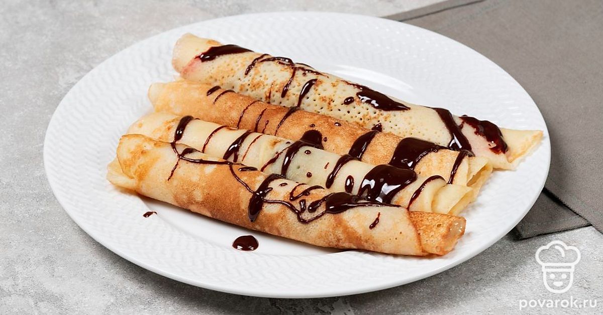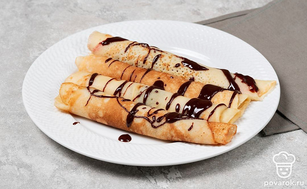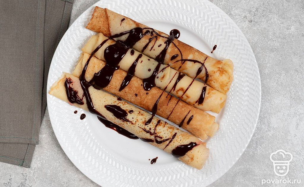 Разложите блины по красивым тарелкам. Полейте их растопленным шоколадом и подайте на завтрак.