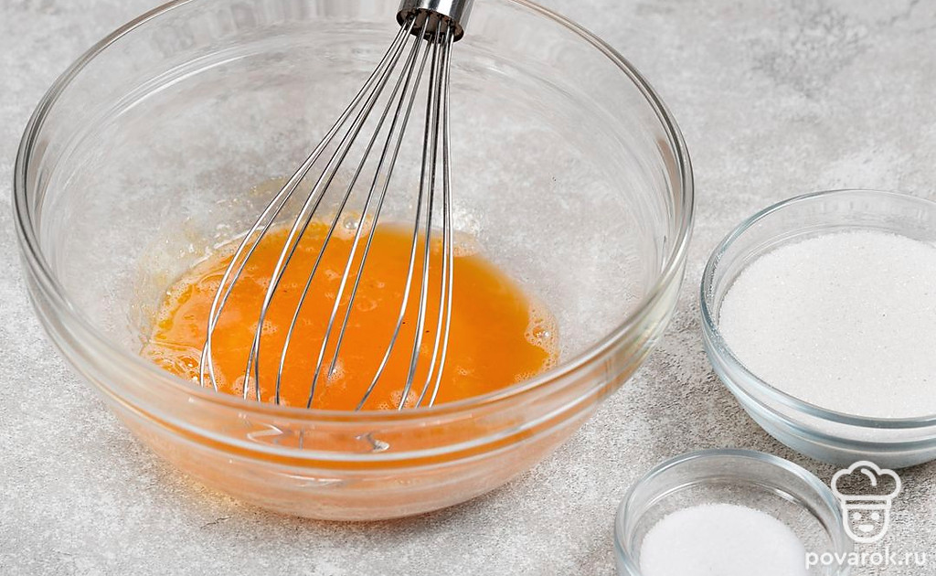 Разбейте яйца в миску и смешайте их с солью и сахаром.