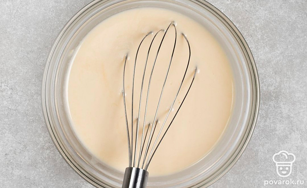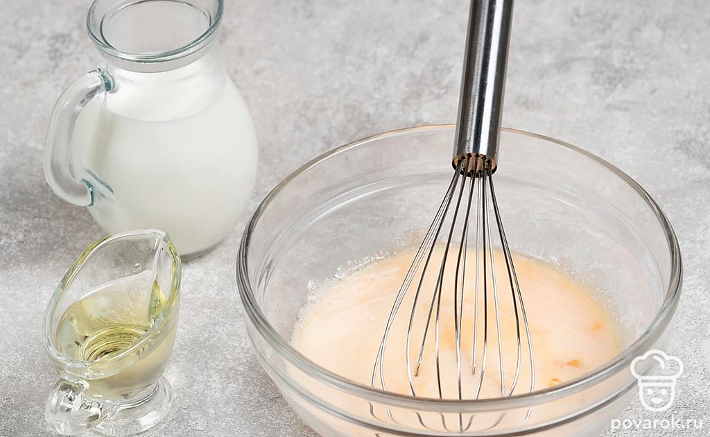 Всыпьте в ту же миску муку и разрыхлитель. Замесите тесто венчиком.