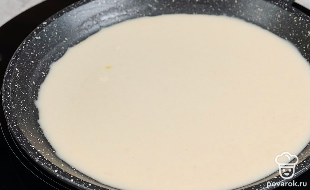 В центр сковороды влейте порцию теста и быстро распределите ее по всей поверхности.