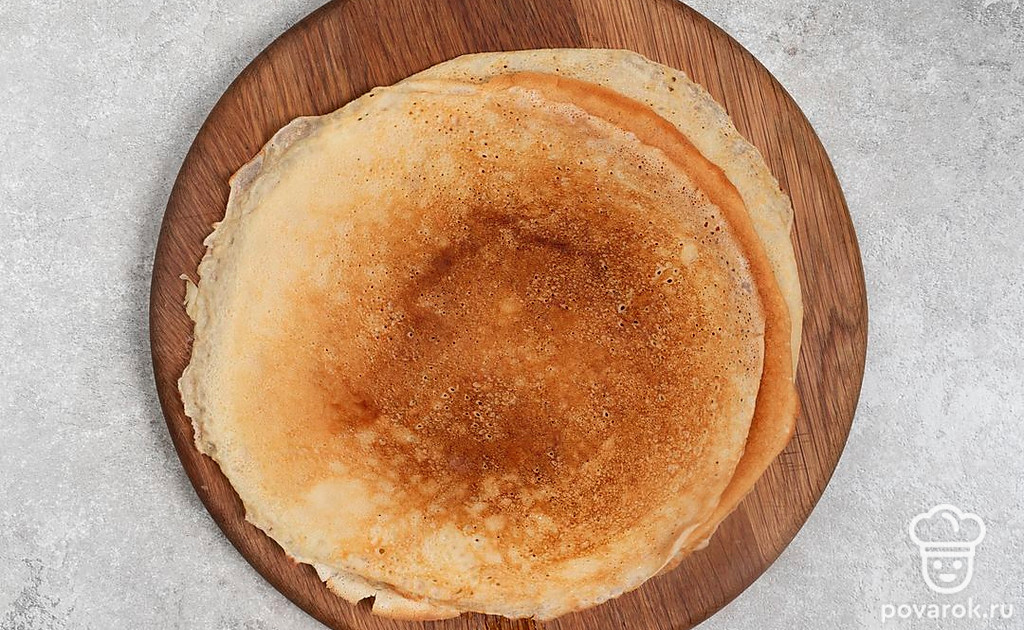 Когда края теста начнут подсыхать, аккуратно переверните блин. Подрумяньте его еще в течение минуты. Таким же образом обжарьте все блины.