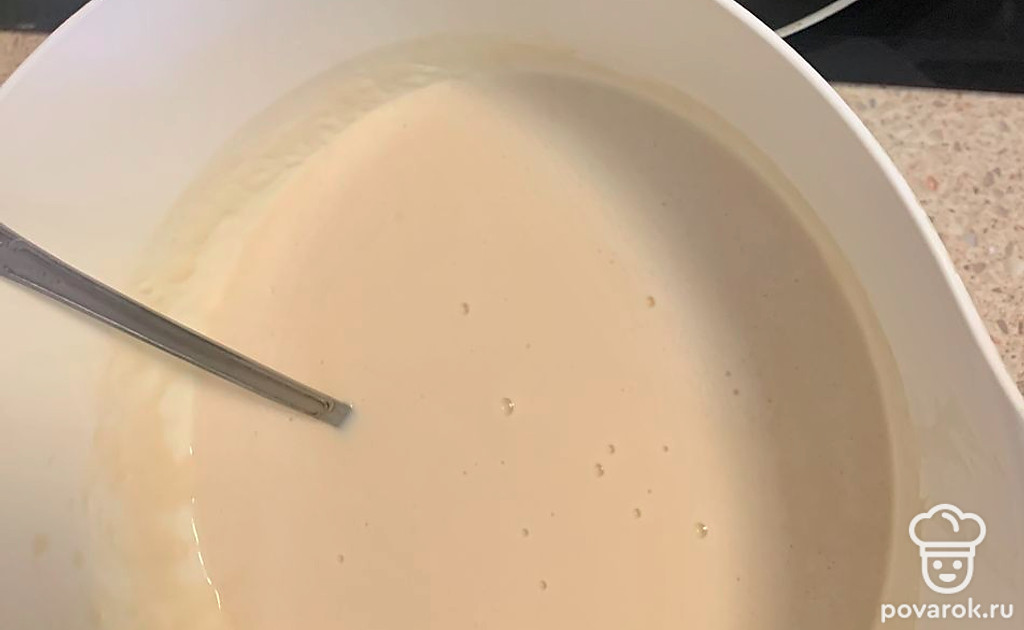 В полученное тесто влейте кипяток, перемешайте. Дайте тесту настояться (10-15 минут). Тесто жидкое, но при этом плотное. Без комочков.