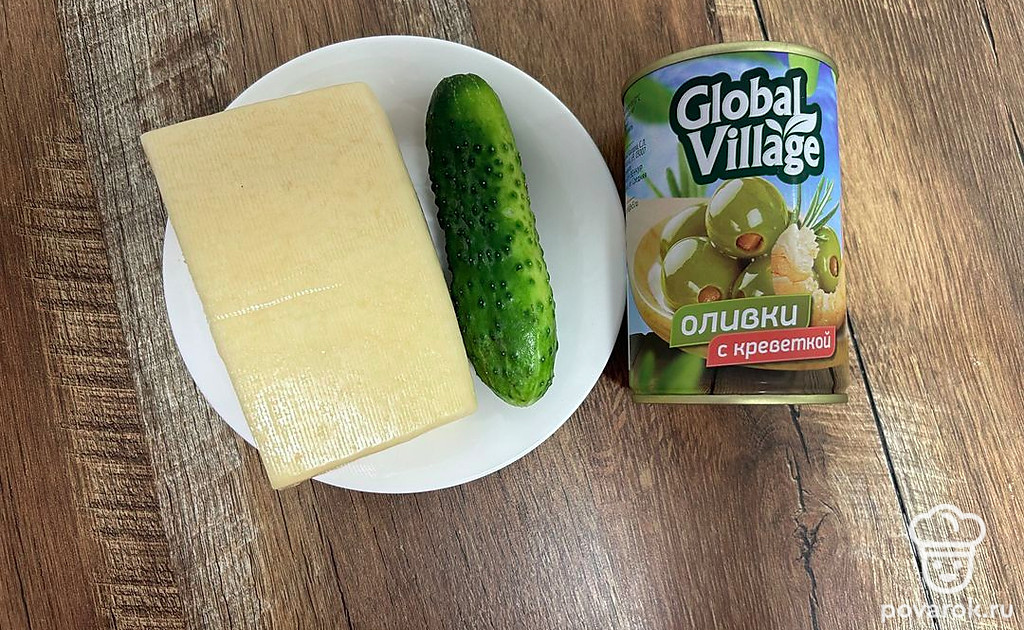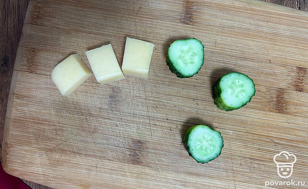 Сыр нарежьте большим кубиком. Огурец нарежьте на кольца толщиной 2-3 сантиметра.