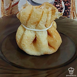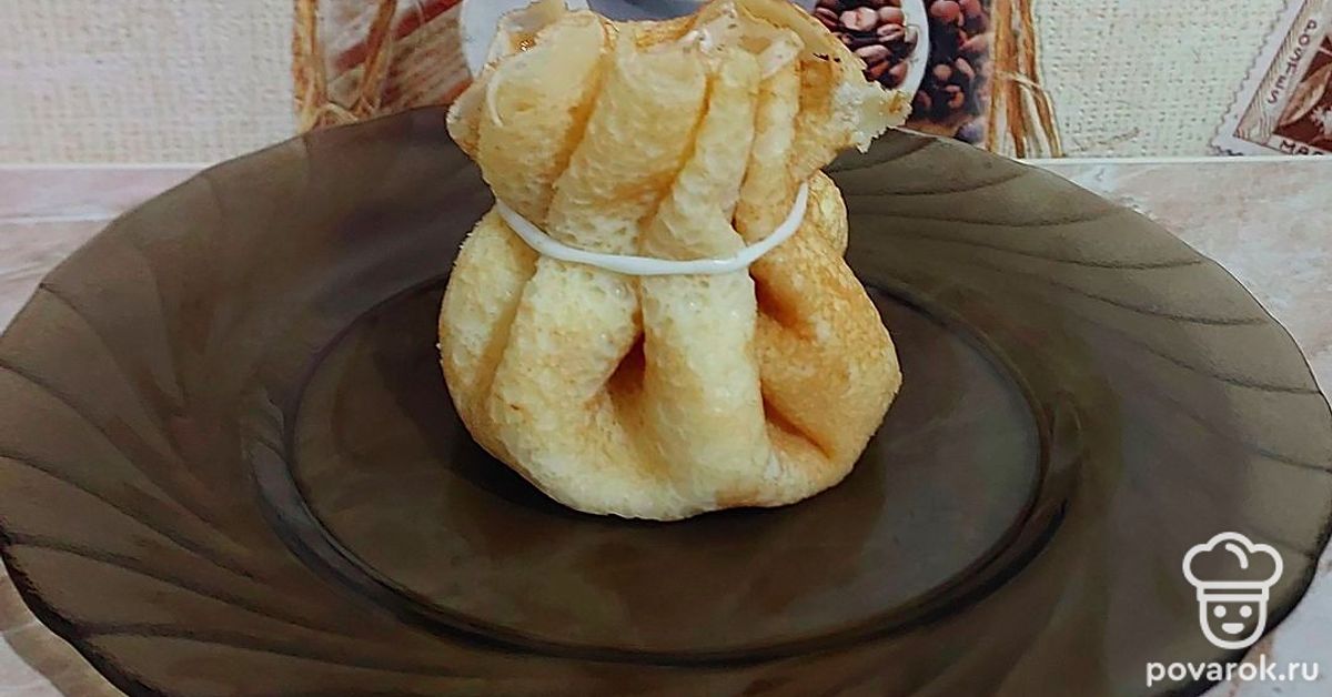 Защипните края, формируя мешочек. Верх свяжите сыром (косичка).