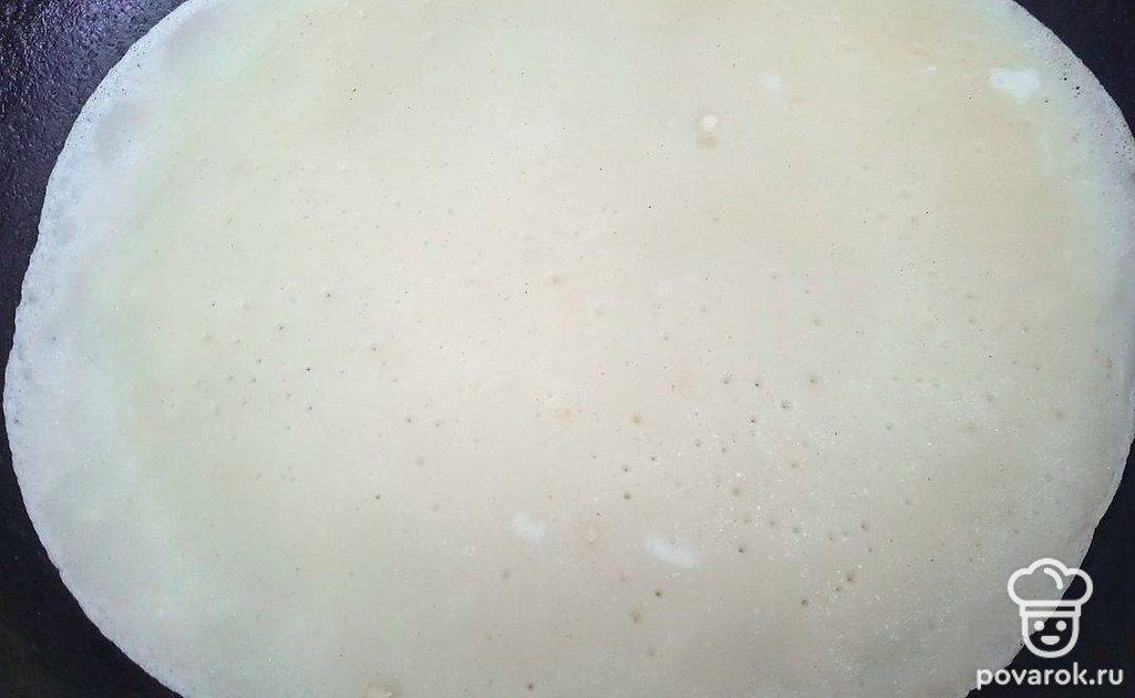 На разогретую сковороду выливайте порционно тесто, чтобы получился тонкий блинчик.